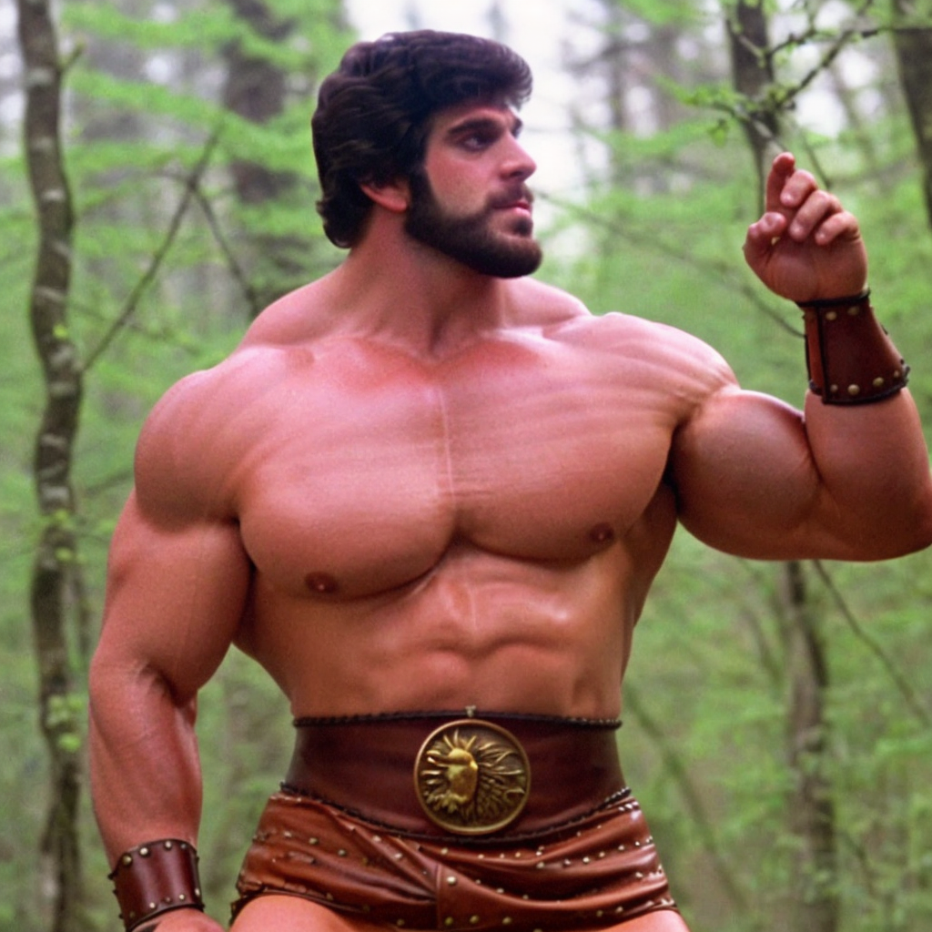 The implied menace from the gorillas and the bears harkens back to the infamous Hercules-vs-bear fight of the first film. It would be great to see more images of Hercules in perilous situations. At least as much as the AI generator will allow.